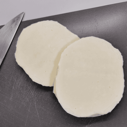 Сыр нарезать слайсами толщиной около 1 см и диаметром около 10 см.