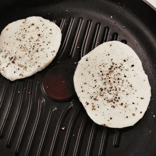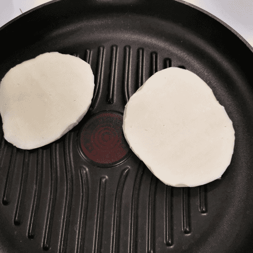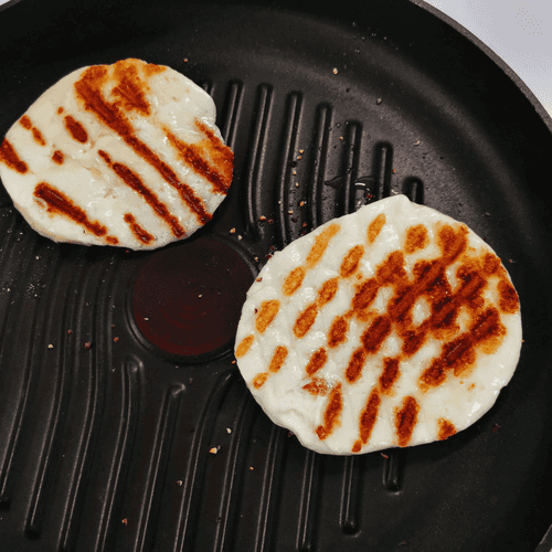 Разогреть смазанную маслом сковороду гриль и выложить на нее сыр.