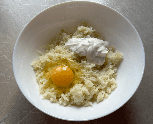 Добавить яйцо, сметану и соль.