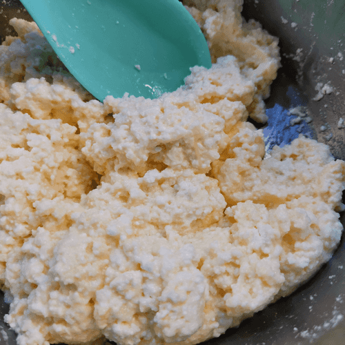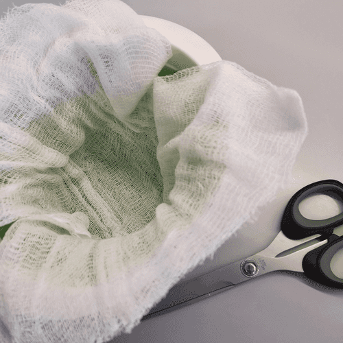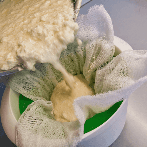 В форму для сыра (или в сито, вложенное в кастрюлю) выложить марлю, сложенную в три-четыре слоя.