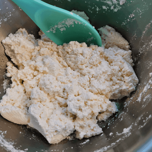 Убавить огонь до медленного и частями класть в молоко творог. Варить около 5 минут, пока не отделится сыворотка.
