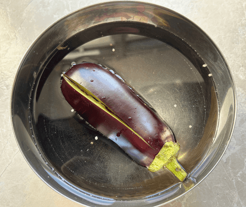 Хорошо просолить баклажан внутри и замочить в воде на 15 минут.