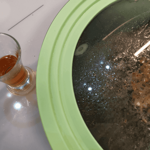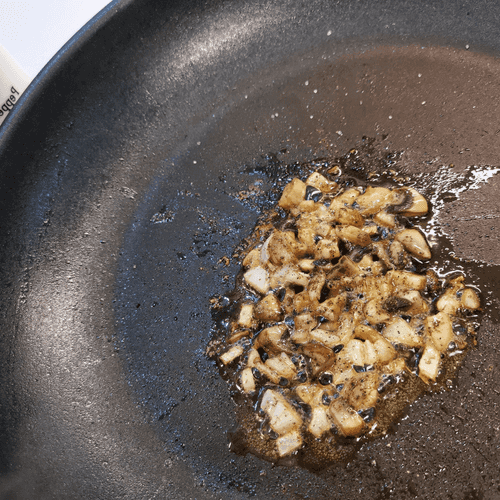 Через 1 минуту влить коньяк, перемешать и накрыть крышкой. Готовить еще около 2 минут.