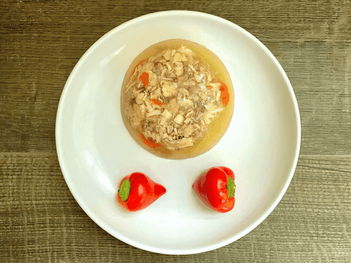 Разобрать мясо и овощи и разложить по мисочкам. Залить бульоном мясо и поставить в холодильник на 2 часа. При подаче украсить перчиками черри.