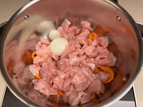 Курицу помыть и обсушить. Мякоть отделить от костей, мелко нарезать и добавить к овощам.