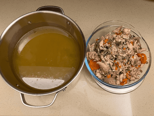 Отделить бульон от мяса и овощей, вынуть кости.