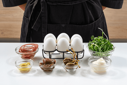 В конце украсить яйца ломтиками каперсов и микрозеленью.