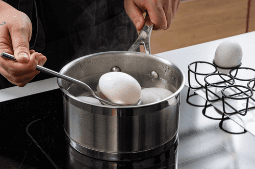 Сварить яйца вкрутую, затем охладить.
