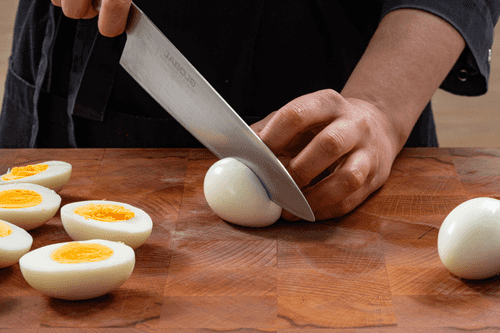 Очистить яйца и разрезать пополам.