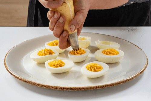 Выложить желтковую массу в половинки яиц.