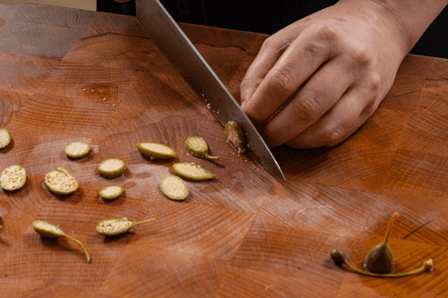 Нарезать каперсы тонкими ломтиками.