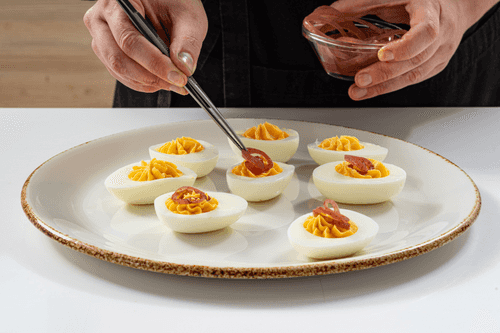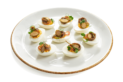 Фаршированные яйца с анчоусом и маринованным луком – это изысканная закуска европейской кухни, сочетающая нежность яичного желтка с пикантными нотками анчоусов и легкой кислинкой маринованного лука. Истоки подобного блюда уходят в традиции средиземноморской гастрономии, где анчоусы играют важную роль в создании насыщенных вкусов. Кремообразная текстура начинки, дополненная горчицей и майонезом, идеально сочетается с солоноватым оттенком каперсов и свежестью микрозелени. Элегантная подача – анчоусы, свернутые розочкой, – делает закуску не только вкусной, но и эстетически привлекательной. Эти яйца станут украшением праздничного стола, радую гостей своим утонченным вкусом и аппетитным видом.