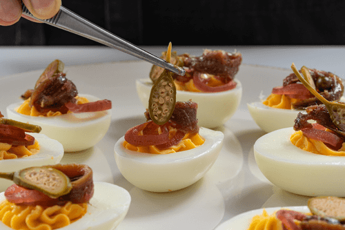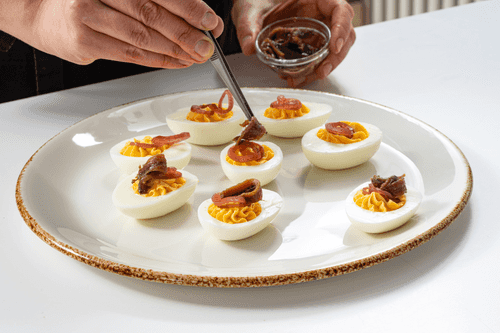 Фаршированные яйца с анчоусом и маринованным луком
