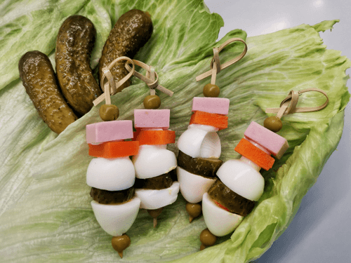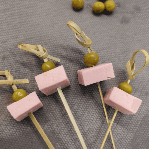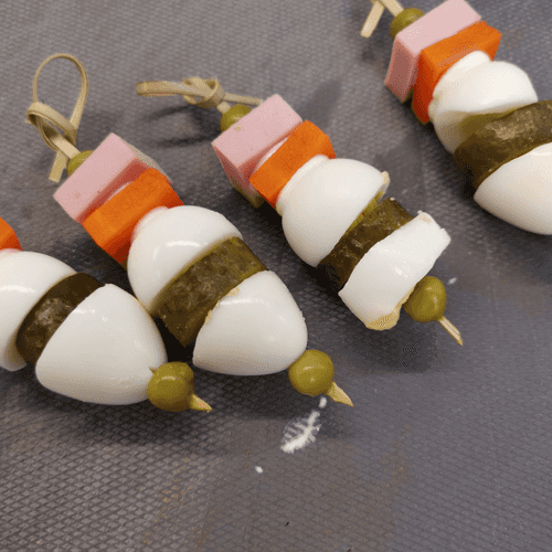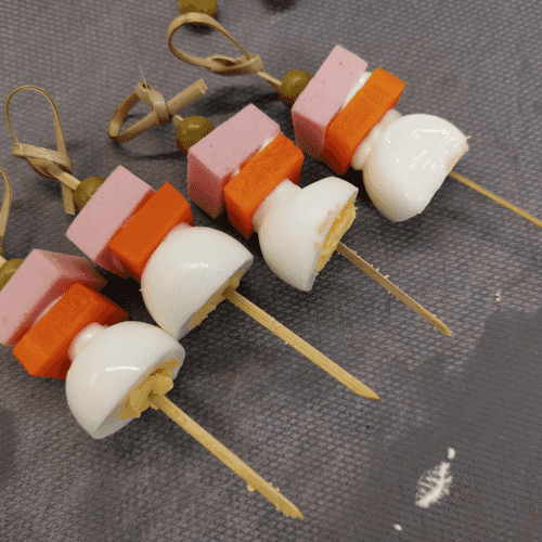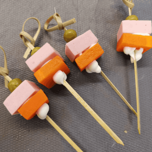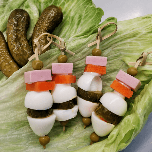 Канапе «Оливье» — оригинальная интерпретация знаменитого русского салата, преобразованная в удобную форму для фуршетов. Этот изысканный вариант традиционного блюда передает весь его вкус в одном небольшом, но насыщенном кусочке. Нежные перепелиные яйца, сочная докторская колбаса, свежие огурцы и сладковатая морковь — всё объединяется легкими нотками майонеза и завершается пикантным зеленым горошком. Блюдо подходит как для праздничных застолий, так и для неформальных встреч, восхищая гостей своей элегантностью и удобством подачи. История классического салата «Оливье» уходит корнями в XIX век, но эта версия предлагает новую подачу, сохраняя дух традиции. Эти канапе — идеальный способ насладиться легендарным вкусом, не используя вилки и ложки.