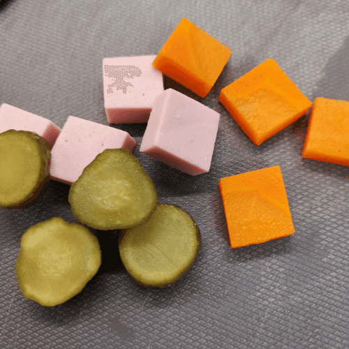 Нарезать морковь и колбасу квадратиками толщиной около 7 мм. Огурец нарезать кружочками такой же толщины.