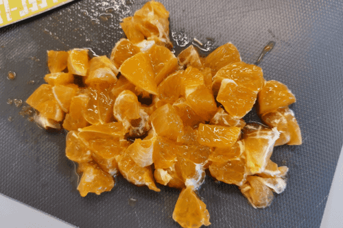 Нарезать мандарин кубиками.