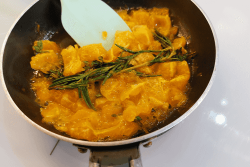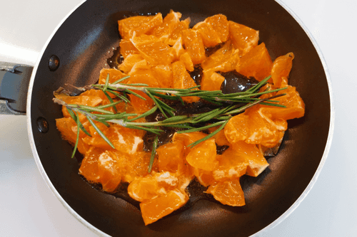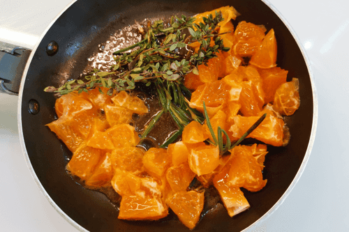 Выложить мандарин на сковороду. Добавить розмарин.