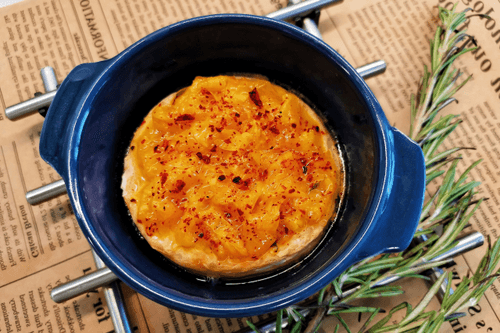 Сыр бри с мандариновым чатни — это изысканное блюдо французской кухни, в котором нежность сливочного сыра встречается с яркими цитрусовыми нотками. Бри, известный своим бархатистым вкусом и мягкой текстурой, становится еще более утонченным после легкого запекания. Ароматный чатни из мандаринов, розмарина и тимьяна придает блюду сладкую пикантность и глубокий пряный оттенок. Контраст температур — теплый, растаявший сыр и освежающее фруктовое чатни — делает его идеальным дополнением к бокалу белого вина. Это закуска, которую можно подать на праздничный стол, удивляя гостей изысканностью французского гастрономического искусства. Капля хлопьев чили придаёт композиции едва уловимую остроту, гармонично завершая богатство вкусовых ощущений.