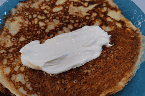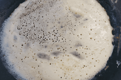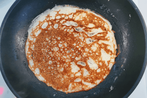 Когда блин подрумянится, перевернуть и жарить еще 2 минуты на среднем огне.