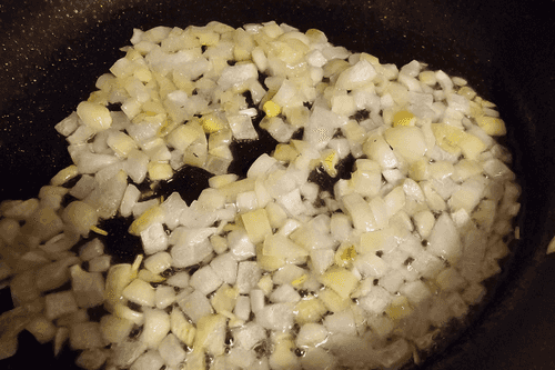 Нарезать и обжарить лук, но чтобы он не был как вареный.