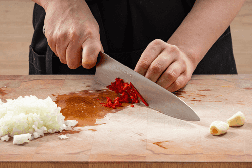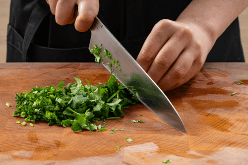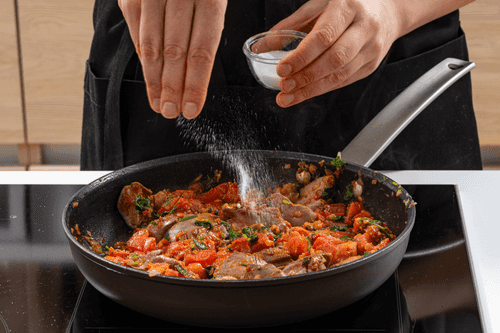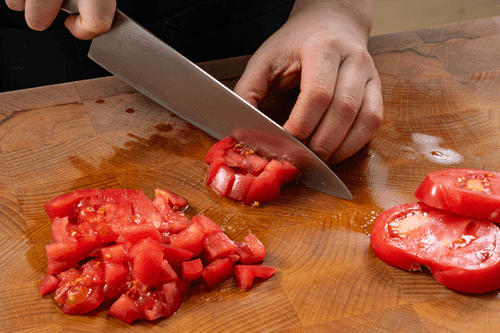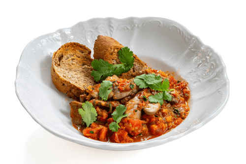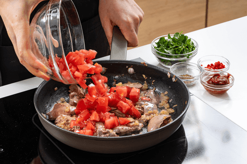 Через минуту добавить к печени томатную пасту, помидоры, перец чили, чабер и кинзу.
