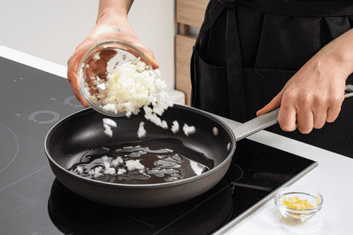 Разогреть в сковороде растительное масло и обжарить в нем лук до золотистой корочки. В самом конце добавить чеснок.