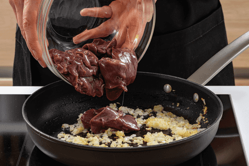Обсушить печень на бумажных полотенцах и отправить в сковороду к луку и чесноку.