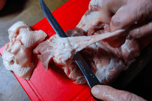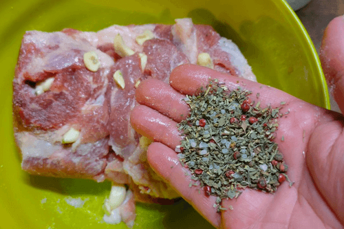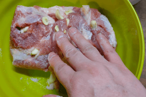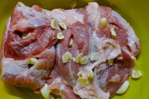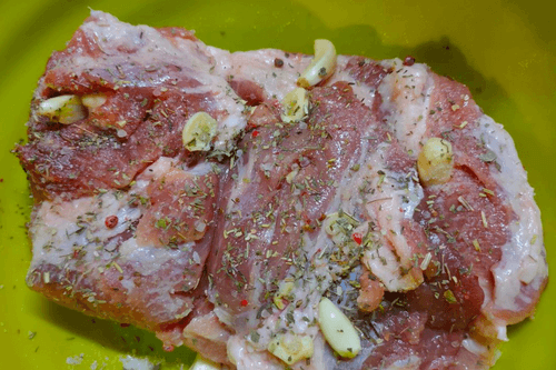 Далее сделать ножом проколы для того, чтобы можно было нашпиговать кусок мяса.