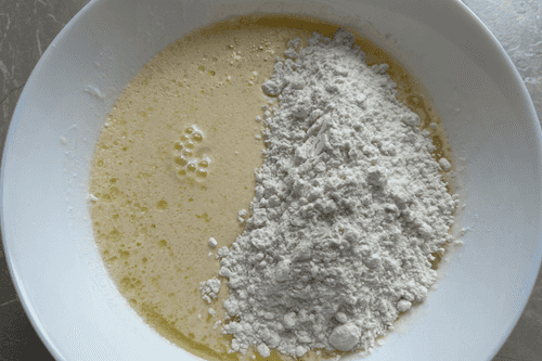 Всыпать муку и соду.
