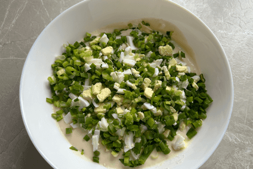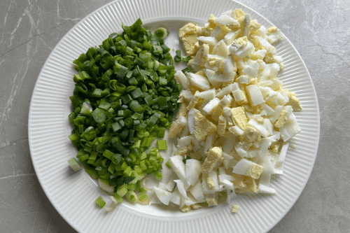 Нарезать яйца (2 штуки, отварные) и лук.