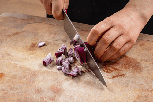 Красный лук крупно нарезать.