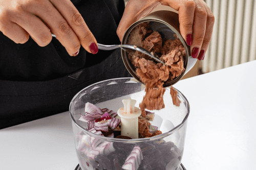 Из банки с тунцом также слить жидкость и положить рыбу в блендер.