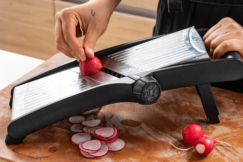 Редиску нарезать тонкими кольцами и выложить в холодную воду.