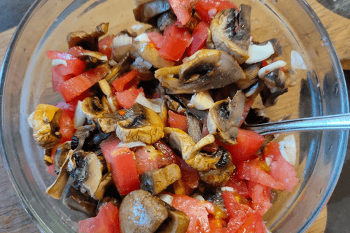 Нарезанные овощи и грибы смешать в миске.
