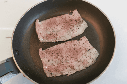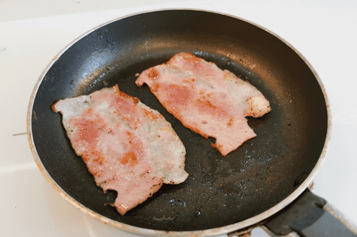 На разогретую сковороду выложить бекон. Обжаривать 2–3 минуты на сильном огне.