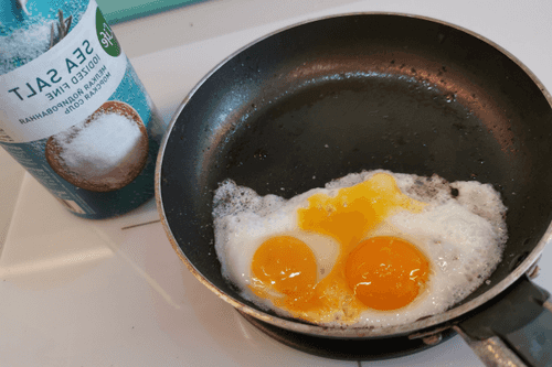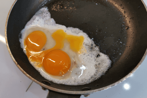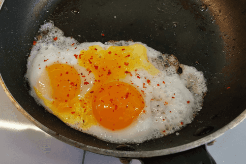 Поджарить яйца в вытопившемся от бекона жире до схватывания белков.