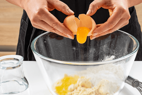 Приготовить тесто: смешать муку, крахмал, воду (150 г) и яйцо, перемешать венчиком или блендером.