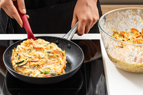 Разогреть небольшую сковородку с растительным маслом, выложить тесто на всю поверхность, сформировав один большой блинчик, и поджарить до румяной корочки с двух сторон. Таким образом пожарить все тесто.