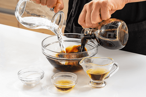 Для соуса разбавить соевый соус водой, добавить рисовый уксус, кунжутное масло и сахар. Перемешать до растворения сахара.