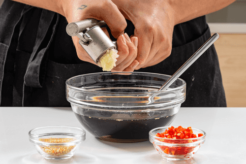 Туда же добавить пропущенный через пресс чеснок и кунжут.