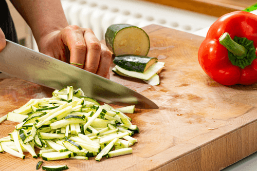 Сладкий перец и цукини нарезать тонкой соломкой.