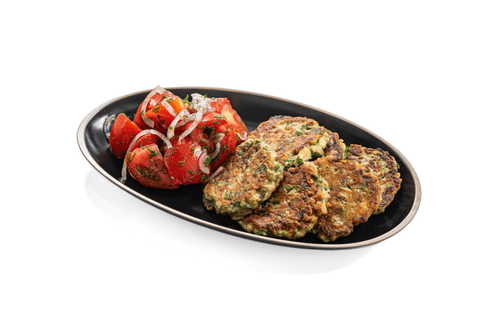 Оладьи из баклажанов с салатом из помидоров