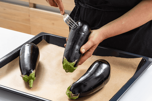 На баклажанах сделать проколы ножом или вилкой. Разложить на противне и запечь в разогретой до 200 градусов духовке 20–25 минут. Проверить готовность ножом: лезвие должно легко входить в мякоть, а кожица — подрумяниться.