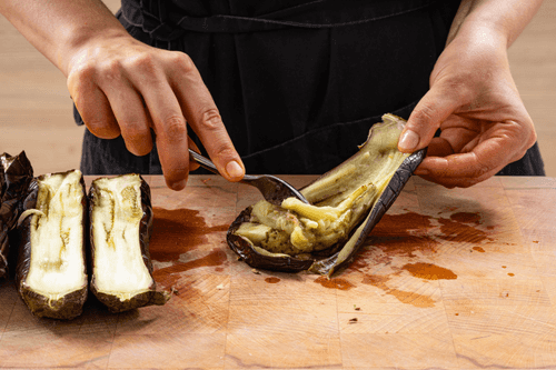 Разрезать баклажаны вдоль пополам и выскоблить мякоть ложкой. Если баклажаны крупные и в них много семян, изъять их и выбросить.