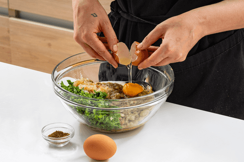 Смешать мякоть баклажанов, лук и сырое яйцо, добавить сванскую соль и рубленую кинзу.