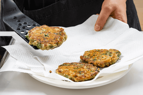 Переложить оладьи со сковороды на бумажное полотенце, чтобы избавить от лишнего масла.