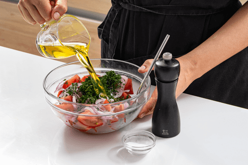 Смешать в миске помидоры с луком, добавить рубленый укроп. Посолить по вкусу и заправить ароматным маслом.