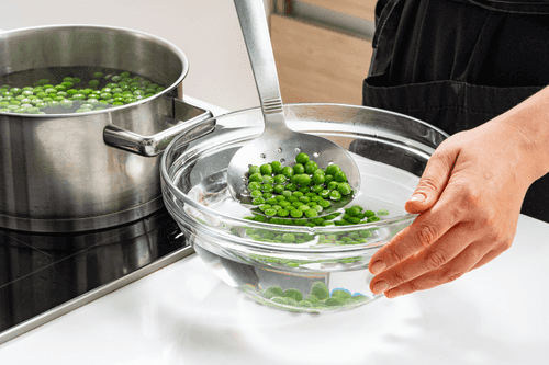 Закинуть горошек в кипящую воду и варить 2 минуты. Перекинуть горошек в ледяную воду, чтобы сохранить цвет. Откинуть на сито.
