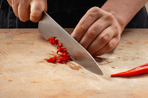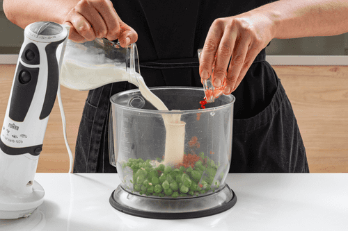 Отделить четверть горошка и отложить. Остальной горошек выложить в блендер, добавить молоко и перец чили и измельчить.