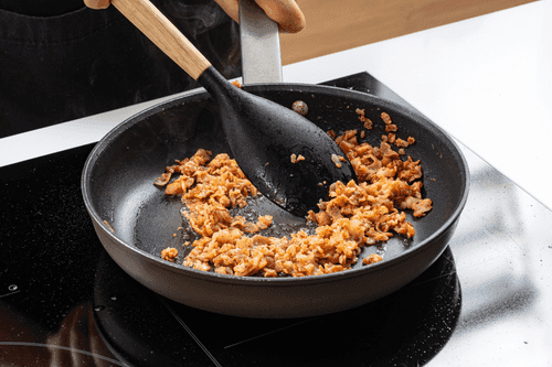 Бекон нарезать небольшими кусочками и на медленном огне обжарить до состояния румяных шкварок.